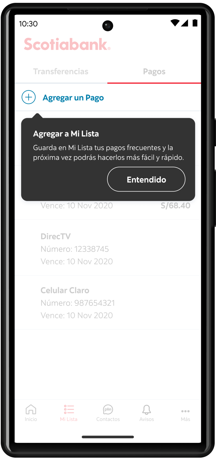 Mi Lista is Scotiabank’s frequent transactions space, while working on this project, the goal was to have a better organization and to enable users to add, edit and find their payments easily.